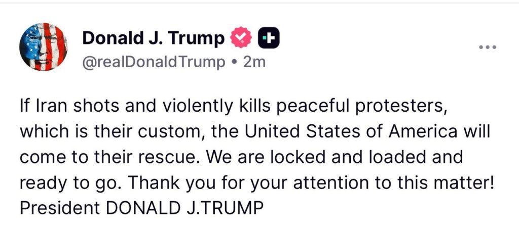 دونالد ترامپ، رئیس جمهور آمریکا، در اولین موضع رسمی مداخله جویانه خود درباره اعتراضات در ایران نوشت: اگر ایران به معترضان مسالمتآمیز شلیک کند و آنها را بهصورت خشونتآمیز بکشد ــ ایالات متحده آمریکا برای نجات آنها وارد عمل خواهد شد. ما آماده، مسلح و در حالت آمادهباش کامل هستیم